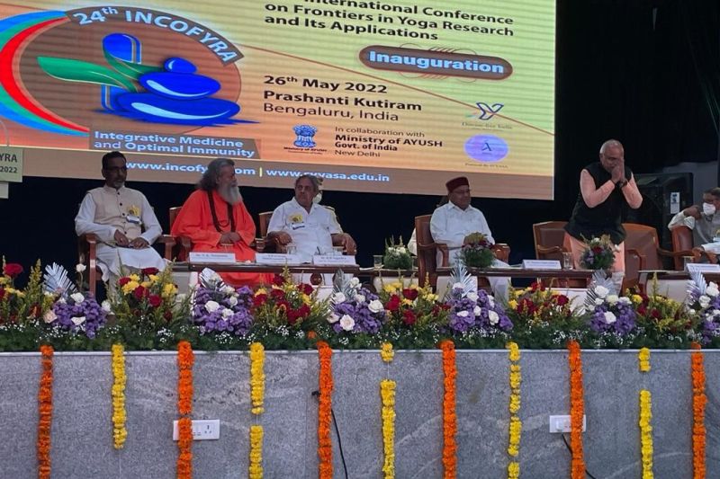26 May 2022 – Vishwaguruji travels tirelessly, giving blessings and participating in numerous events related to spirituality and yoga. Thus, on May 26, he participated in the 24th International Conference on Frontiers in Yoga Research and Its Applications (INCOFYRA) in Bangalore (Bengaluru), Karnataka state in India.